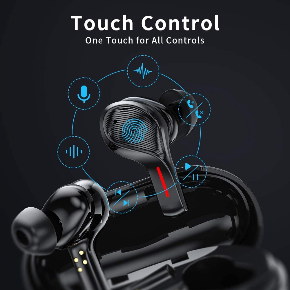 ? 【One-step Paring & Touch Control 】Open bluetooth to find "T12" on bluetooth device list, click "pairing" to connect it. The running earbuds will quickly paired and reconnected again to the last connected device automatically next time. Desighed to greatly reduces the pressure on our ears, you can touch earphones bluetooth to realize play / pause music, previous / next song, answer/ reject a call, activate Siri, etc.